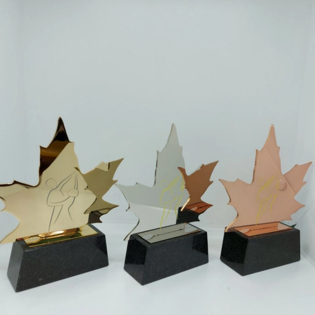 Auszeichnungsstatue „Ahorn-Grazie“ — eine stilvolle und elegante Auszeichnung in Form eines Ahornblattes. Gefertigt aus Metall mit spiegelnder Oberfläche und auf einem stabilen Steinsockel montiert. Ideal für Firmenveranstaltungen, Wettbewerbe und feierliche Ehrungen. Erhältlich in Gold, Silber und Bronze. Individuelle Gravur möglich.